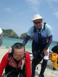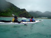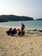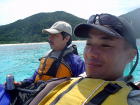 えーと、悪そうな顔してます(笑) 今回の「〜ファイナルミッション〜 クジラを探しだせ!!」を託されたメンバーです。 もういないだろうと思われていたクジラ、実は行きのフェリーで 「もういいよ〜」というくらい親子クジラのブリーチングを見ることができて、おなかいっぱい♪ カヤックに乗るころには「さあ、どこで飲もうか〜」なんて。 この頃、大城さんはある作戦を決行しようとたくらんでいました。。。 |
