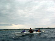 雨が降った翌日、 向かい風の中を2時間、がしがし漕いで海峡を横断した後、 今まで漕いできた海を振り返ってみると。 とても穏やかな光が差し込んでいました。 昨日はどしゃ降りだったから 今日はごほうびに晴れてくれたんだね、とみんなで話をしていました。 西の空に夕陽が沈んでいくのがわかり、 すぅーっと薄いきれいな雲がその夕陽のほうにのびていくのが見えたのでした。 |