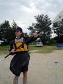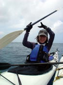 山下さん、漕いでないです。 よく見えないですが、実は300円の傘で前に進んでいます!! 30分後、傘の役目は終了していました。。 |