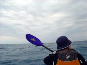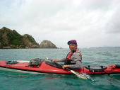 今日は先日までの強い風がちょっとおさまり、晴れている海を漕ぐことができました。[ 海を見るなり、みんな「気持ちいいね〜」と言い合います。 関東からやってきた3人のお客さんは この間は千葉で12月に漕いで「2回も!」沈したそうです。。。 今日はきっと大丈夫! はりきって岡波島に向かいました。 |