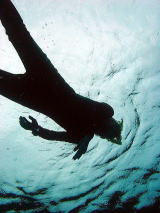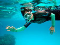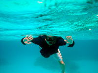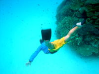 もずく入れ(仮)で水中を覗いています。 「青い魚きれいだね〜ルリなんとかタイ??」 「あの黒い魚おいしくなさそうだねー」 「・・・」 「食べられるかどうかが重要なんだね」 |