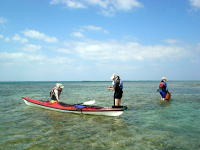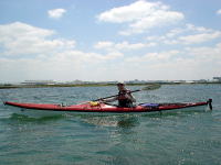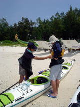 シーカヤックが初めてという木村さん。 PFDの着方を教わっています。 うちなーんちゅの顔をしているので 最初はみんな「沖縄から参加する人もいるんだ〜」と勘違いしていました(笑) ほんとは奈良の人です。 かけ声は「1、2、シーサー!」でした。 |