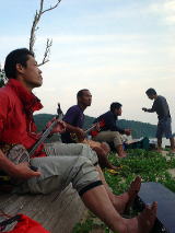 穏やかな夕暮れ、誰もいない浜にさんしんの音が響きます。 贅沢なことに、この日は二人もうた唄いが。 ゆっくりと時が流れ、 自然とみんなの動きがゆっくりになります。 |