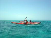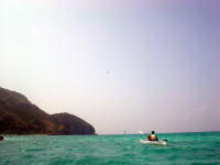 こちらははじめて慶良間の海を漕ぐという貴子さん。 帽子が飛ばされる!というハプニングもありましたが(汗) 後ろのだんなさんと二人で「ソーキそば!」とかけ声をかけながらがんばりました。 |