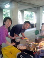 久しぶりに「直線的な」屋根の下での朝ごはん。 ずっとずっと無人島にいたような気がして人工的なものに体が慣れないけれど、 おなかは空きます? キャンプ中の料理、たくさんありすぎてみんなの顔が丸くなっているような・・・ 気のせいですよ(笑) |