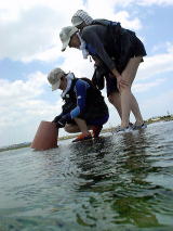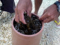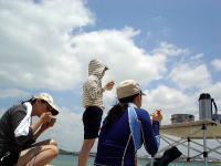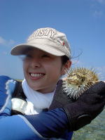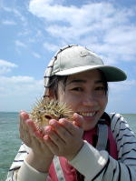 今回、急遽「もずく狩り♪ツアー」に参加することになった 葉山さん、三浦さん、柏木さんの三人。 天然のもずくが採れると聞いて柏木さんは大喜び!! アバサーを捕まえても喜んでいたのは二人だけ(笑) 記念写真を撮ったり、水をかけてあげたり。 眠たげなアバサーは「ぐぐっ」っと言いながら、がんばって膨らんでくれました。 かわいかった〜 柏木さんは見に来ることもなく、もずくに一所懸命でした。 |