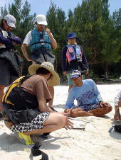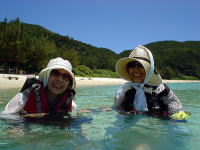 今回がはじめての慶良間、新井さん。 大城先生からの講義を真剣に聞いています。 傍では井関先輩&後藤先輩が心配そうに見守ります。 新井さんとまきには恒例の「あついと言ったら1000円!」ゲームの説明もされました。 「あつい」&「あっち」 がダメだよとたかしさんが砂浜に書いて説明してくれます。 新たなルールも開設され、夕方19時〜朝7時までは「さむい」と言ったらアウト。 今回は罰金の値段がハンパないです(泣) |