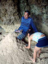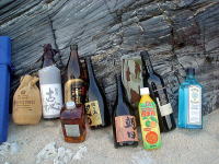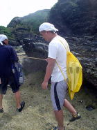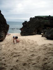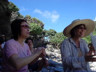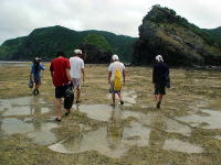 浜にあがってお菓子を食べて充電ができたら、 今度は大城さんが見つけてきた浮きと、おとうさんが拾ってきたペットボトルを使ってボウリングです。 |