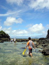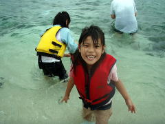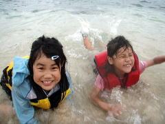 もう海の中で遊べるのが楽しくて仕方ないようです。 このあと「水着になるっ!!」と言って服を脱ぎ捨てていました・・・(笑) 波が来るたび「きゃー!!!」と言って波乗りを楽しむ二人。 「いっしょに入ろうよ!」と言われおそるおそる入ると、すげーさむい。。。 子どもって体温高いんですっけ?? その横では「狩猟活動にいってきます」と海パンでおとうさんが海の彼方に。ではなく、岩のほうへ。 片手には大城さんに借りた道具。 おかあさんは箱めがねを覗いたまま、これまた遠くへ。 うーん、守屋家族おそるべし。 久しぶりの海で、みんなはしゃぎまくってました♪ |