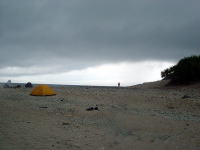キャンプ地に帰ってくると不穏な雲が覆って。。。 この後、暴風雨と雷に見舞われ新井さんのテントが床上浸水! 今夜の寝床がなくなってしまい、 肩を落としながらみんなが飲んでるタープに避難してきました。 |