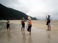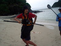毎年遊びに来てくれる今回のCAMPのメンバー。 手にはおいしいお酒をしっかり持って、梅雨真っ盛りの沖縄にいらっしゃいました♪ 漕いでる時間より飲んでる時間のが絶対長いっ!! 「漕いでたよ!」ということを証明するためにパドルを持って記念撮影です。 |