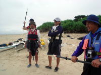 最終日、もう帰ろうねというときに急遽始まったパドリング講座。 井関先生に新井くん、たかしくん、北くんが習います。 |