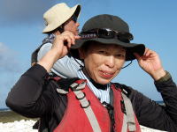 今回、初シーカヤックの大津さん。 大城艇のセーリングにニコニコ顔です。 カメラを向けるといつも、「ピース!!」とかわいく笑ってくれました。 |