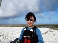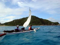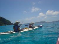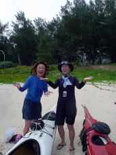 「こんな海を漕げるなんて、私たちしやわせね〜♪」 10年越しの夢がかなってうれしそうなバウマンのお二人。 後ろで「でしょでしょ?」と言わんばかりのだんなさん’s。 |