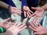 ほら! 見せてくれた手には。 豆ができていました。 破れている人まで・・・痛そう! |