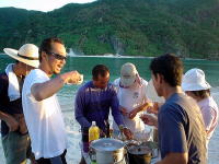 「しやわせ〜♪」ツアー、最初の一枚はこれ。 今、20時なんですよ。 「えー!19時前かと思った!!」 満月のお陰でこんなに明るいんです。 こんな風に海でゆっくり月見ができるのも、梅雨明けの沖縄ならでは。 3日間、月でできる影を楽しみながら夜が更けていきました。 スタッフはと言えば・・・ ついついカクテルを飲みすぎて、ご飯を作ることを忘れそうでした(笑) |
