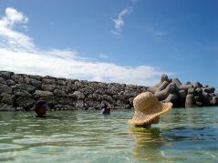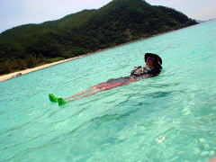 「あ゛ーいい湯だね〜♪」 (リポーター風に)今日はちょっと足を伸ばして無人島の海中温泉までやってきました。 二人ともしやわせそう顔をしていますね〜 って、温泉ではないんですけどね(笑) ここのところの沖縄、ずーっと熱帯低気圧や台風にはさまれ、いじめられ、いたぶられて 海に出て遊ぶことができませんでした。 この日はなんと10日ぶり!!のツアー。 昨日でも明日でもきっと海には出れなかったでしょう。 大学のときからの友達だというひがみさん&すなおさんの最強タッグです。 ラッキーすぎです!! |