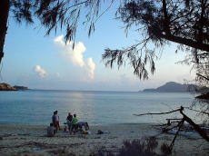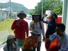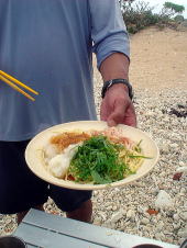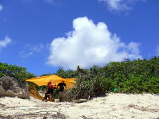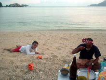 島に着いてぐいっとオリオンビール&セブンアップを飲んだあと。 薪を拾いながら見つけた彷徨えるヤギ。 キャンプ地に帰りすぐに「全員集合!」の声がかかって作戦会議。 結果は・・・ |