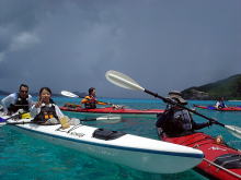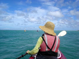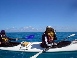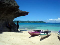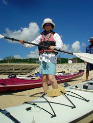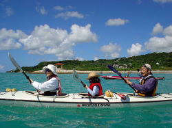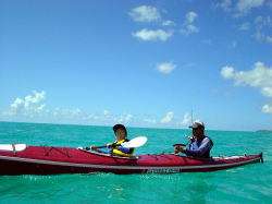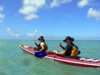 初めてシーカヤックに乗るお二人。 暑いので海の中でイメージトレーニング&体を動かしてもらってすぐに漕ぎ出します。 乗った途端に「うわーーー!すげー気持ちいい!!!」 「いいね〜いいよ〜♪♪♪」 と大変なはしゃぎようです(笑) カメラを向けるとお決まりのピース♪ |