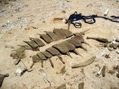 巨神兵? ではなく、ウミガメの甲羅の骨(たぶん)です。 Wさんと二人で組み立ててみたものの・・・あってるのかな?? 見せてもらったあとは、ちゃんと砂に埋めてきました。 |