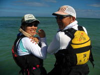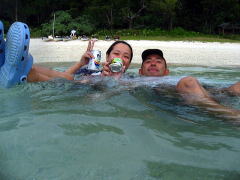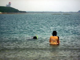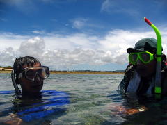 温泉のようにあったかくなっているタイドプールでシュノーケリング。 魚を見つけては「おぅーい!」と周りにいる誰かを呼んで「見てみて!!」と見せます。 |
