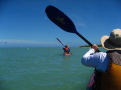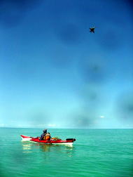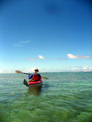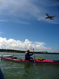 | お仕事では何度も来ていらっしゃるけれど、初めて沖縄の海でシーカヤックをするというKさん。 1日目は、空港の近くの海へ遊びに行きました。 頭の上を飛んでいく飛行機に「おもしろいね〜」と、パドリングの手を止めて 見入ってしまいます。 |