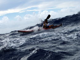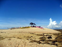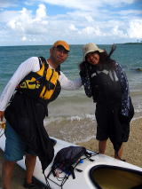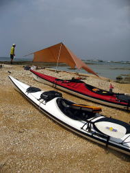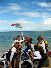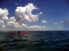 | すーがん(三角波)を超えると、うれしいご褒美が待っていました。 大城艇に帆を張り、いかだを組んで渡嘉志久ビーチまでの5キロほどを漕破! お互いのカヤックのコーミングを力いっぱい持っていないといけないほど、 強い風を受けて、ぐいぐいといかだは進みます。 (セールを持っていたので、写真を撮るどころじゃありませんでした・・・どなたか写真送ってください!) |