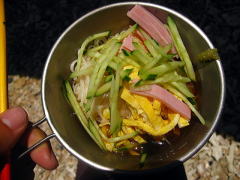 今日のお昼ごはんは二本立て!! 冷やしそうめんと冷やしパスタです。 外で食べると、ただただおいしいです♪ |