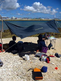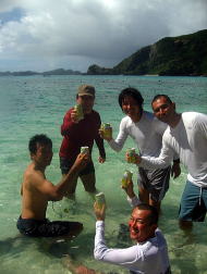 ようやく中間地点、ハテ島に到着! まずはまずはとビールです♪ あれ?さっきまで青空だったのに、後ろから雨雲がきている・・・ |