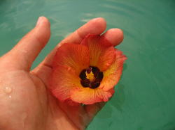 漕ぎ出すと至るところに、ユウナの花が落ちていました。 海の上なのになんで?? エメラルドグリーンの海に映えて綺麗でした。 |