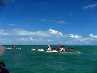 ほんとに台風来るのかな〜と最初は疑ってました。 青空の下を快適にパドリングします。 風があるので、暑くなくてちょうどよかったんです。 しかし・・・ 1時間に一回休憩していくうちにどんどんと風で流される距離が長くなっていき。。。 途中、休憩していたらいぞうさんのパドルがなくなる!というハプニングも!! バウの向きを変えながら、前島に向かって漕ぎ続けます。 |