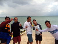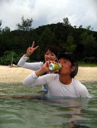2日目は、渡嘉志久湾の中で晴れたり、スコールが降ったりところころと天気が変わる中、まったり遊びました。 シュノーリングでウミガメを追いかけたり、カヤックで釣りをしたり、ビールを飲んだり・・・ 午後からは3名が合流して総勢15名に! 明日は台風でどうなるかわからないから、今日のうちに海三昧!です。 |