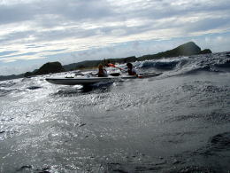 休憩したハテ島から儀志布島を越えて野崎を周るころには、波はばっしゃんばっしゃん。 したくなくても勝手にサーフにのっちゃいます。 このときパドルをはなして写真を撮っていたのは、大城さんただ一人。 こうぶん&あんくみ艇、バウが浮いてます。 ヒロクマさん、このあと波に乗り、すごいスピードで横切って行かれました・・・ |