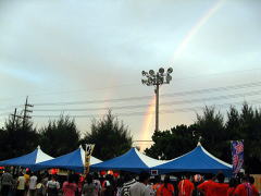 とかしきまつりの会場に着くと、おっきな空にかかった二重の虹が迎えてくれました。 がんばって漕いできたご褒美みたいで、うれしい!! 写真ではあまり色が写っていませんが、鮮やかな虹だったんです。 |