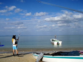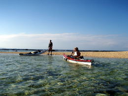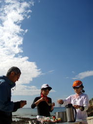 追い風を受けて1時間もかからずにバラスに到着。 大潮の今日は、ちょっとだけ島が小さくなっていました。 潮がひくまで、おやつ&お茶の時間です。 |