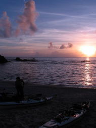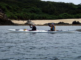 Iさん&Yさんのタンデム艇。 買出しから帰ってきたあと、デジカメを海に落としてしまった!と思ったら、 岸から3歩ほど離れた場所で見つかったという逸話の持ち主。 IさんもYさんも今回のBAJAの写真部隊です。 大城のバウマンは、Nさん。 大城、Yさんのお墨付きをもらっている天性のカヤック乗りです。 |
