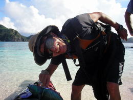 カヤックからのトローリングで一日に一匹のペース魚をGETしたKさん。 手にしているのは、初日にひっかかった(?)ベラです。 マース煮にしていただきました。 タマンもおいしかった♪ ご馳走さまでしたー |