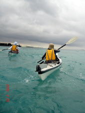 こんな曇り空ですが、二人とも元気! 途中、写真を撮りながらゆっくりと無人島まで漕ぎました。 |
