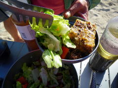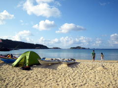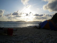 それぞれの夕方の過ごし方。 Aさんはご自分の三味線をつまびき、Kさんはテントの横で本を読み、Bちゃんさんは一眼レフで隠し撮り(笑) 暑い昼間は終わり、涼しい風が吹き始めます。 |