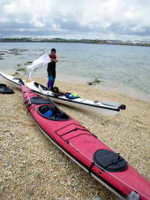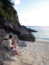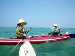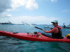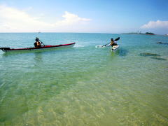 半年ぶりにカヤックを漕ぎに来てくれた、沖縄在住のTさん。 天気が心配でしたが、ちょっと風の強いものの、 初めての東海岸へ漕ぎ出しました。 目指したのは、無人島であるコマカ島。 岬を越えた辺りから、北風が強くなり島への上陸はあきらめてUターン。 海の穏やかなアドキ島という無人島まで引き返すことにしました。 |