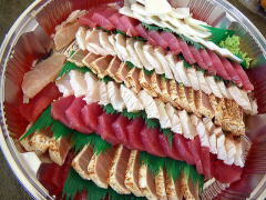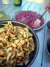 最終日は刺身三昧でした♪ 朝、Aさんが釣ってくださったアオリイカをその場でさばいて食べ、 昼は漁協で買ったマグロ、セイイカ、湯引きしたブダイ、表面をあぶったサワラと Aさんに差し入れしていただいた魚の天ぷら。 こんなに魚が食べられるなんでしあわせです〜 |