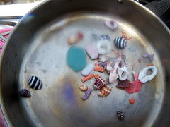 阿嘉島での朝の風景と 渡嘉敷島の砂浜で、Kさんが拾い集めたたからもの。 |