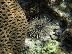 はじめてのシュノーケルでMさんが見つけたウニ。 食べられる・・・はず。 中身は本土で見るものより、少ないようです、。。 |