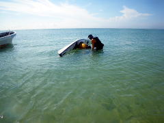 実はこのあと、野生のヤギ、ゆきちゃんも追いかけていました。 まずは大城さんが山に登って、砂浜に追い込み、 砂浜ではみんなが走って、最後は300mくらい離れた岩場で 海に飛び込んでしまったヤギを大城さんがGET! もちろん、大城家の五男坊としておうちに連れて帰られました・・・ カヤックヤギ、漕店では2匹目です。 |