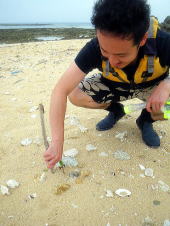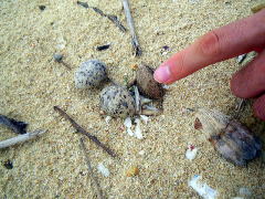 アジサシの卵を踏んでしまわないように、棒をたてて目印をつくっていたのです。 アジサシの卵は砂浜の上に直接、ぽんと置いてあるので 知らずに踏んでしまいそうで危ない!! 毎年、この時期に産みにくるようなのですが、 今年は、今日見たのが初めて。 無事に卵が孵ってくれますように。 |