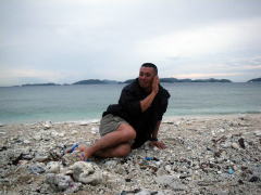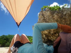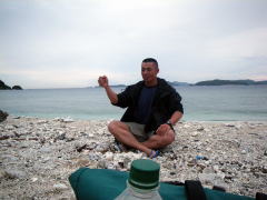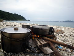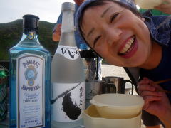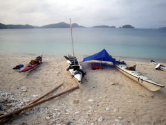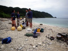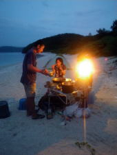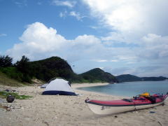 今回のツアー、梅雨が明けて一週間も経っていなかったので きっと「あつい、あつい!」を連発するキャンプになるかと思いきや、 毎日どこかでスコールの降る「いい雨ですね〜」ツアーに。 1日目は、渡嘉志久ビーチからスタートして北上している間に、 慶良間諸島の西、久場島のほうに綺麗な稲光が落ちるのが何度も見えたので、 2キロ漕いで、すぐにビーチに避難。 大雨の中、二度もタープを張り直すなんて一幕も。 泡盛のお湯割りがおいしくいただけました♪ |
