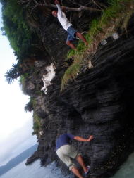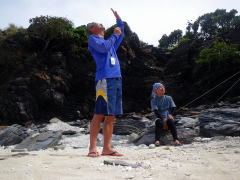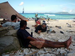 2日目の停滞。 朝ご飯を食べてから、海を見つつ、まったりする面々。 その後ろから、帽子に海水をためたIさんが・・・(笑) |