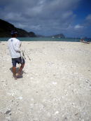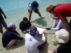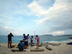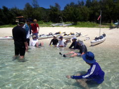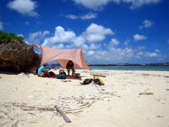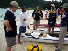 ”あったかい”ので海の中でのブリーフィング。 いつもなら、無人島までちょっと漕いで行って、 4日間、その場所で暮らしてしまうのがCampスタイル。 今回は、慶良間の神様に「たまには漕ぎなさいね〜」といわれてしまったのか(?) 毎日、どこかしらを漕いで行く「焦げ漕げツアー」に。 初日は、安室島まで渡るつもりが、潮流れが予想以上にきつく、 ヒジュイシという浜でキャンプすることに。 2日目は同じ場所に停滞し、いつもの場所ヌシルに着いたのは3日目でした。 |