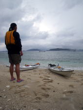 今回は奥さんといっしょに来てくれたI夫妻、前日に日帰りツアーも行っていたWさん、 今回でシーカヤックは2回目のIB夫妻の5名がツアーに参加してくれました。 3日間で、追い風も向かい風も向かい潮も! 体験できたキャンプツアーとなりました。 |