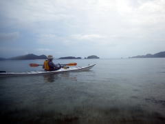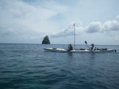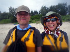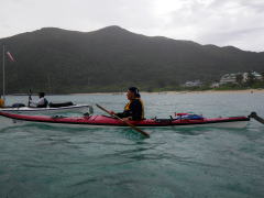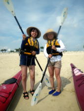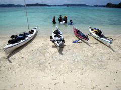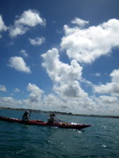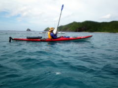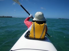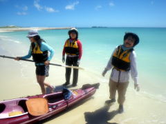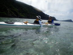 誰もいない無人島まで、横風に逆らって二人艇で漕いで行きます。 最初はぎこちなかったけれど、だんだんと二人の息があってきて、 行きたい方向にカヤックを動かすことができるようになりました。 |